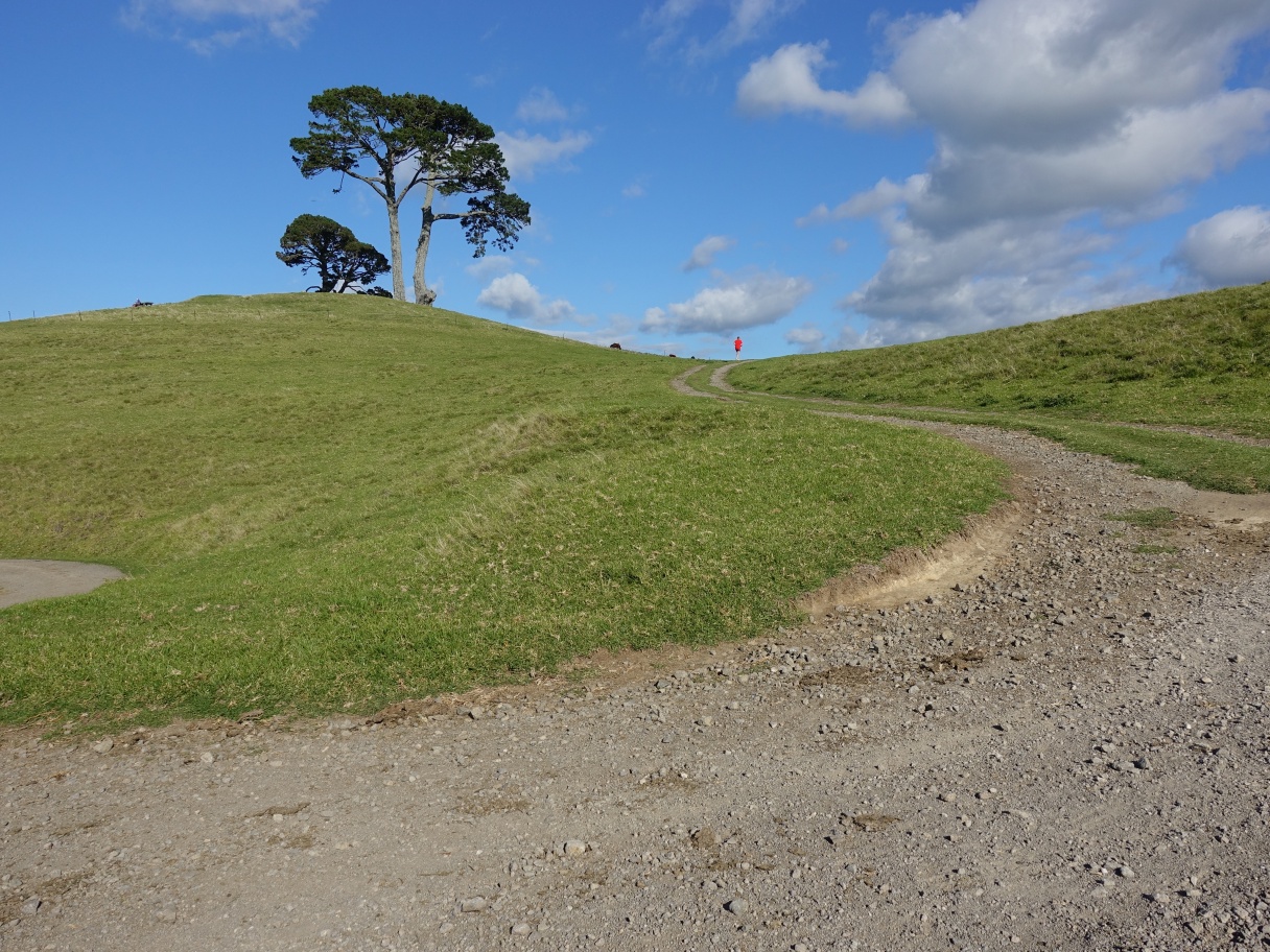 The track arrives at a junction, with the woolshed off to the right, the service road straight ahead with Te Ihu o Ruarangi pa site behind the tree. The service road continues off to the left, which is the part used by most walkers, and which is shown on the aerial photo at the carpark as being Te Rae o Papamoa Track. The alternative track starts at the far end of the visible part of the service road.