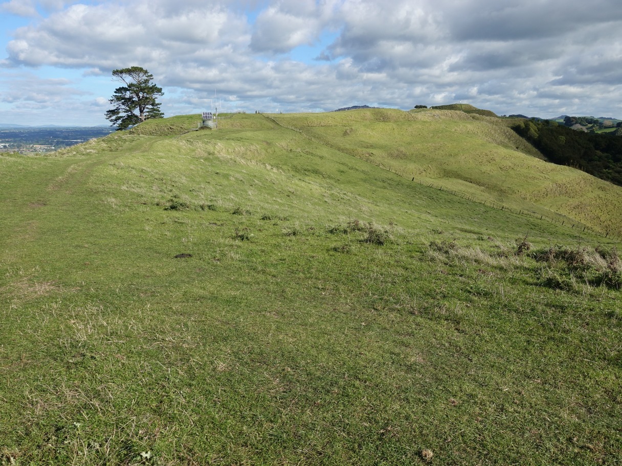 Patakatahi pa site is on the left in front of the pine trees. The track continues up towards the summit.