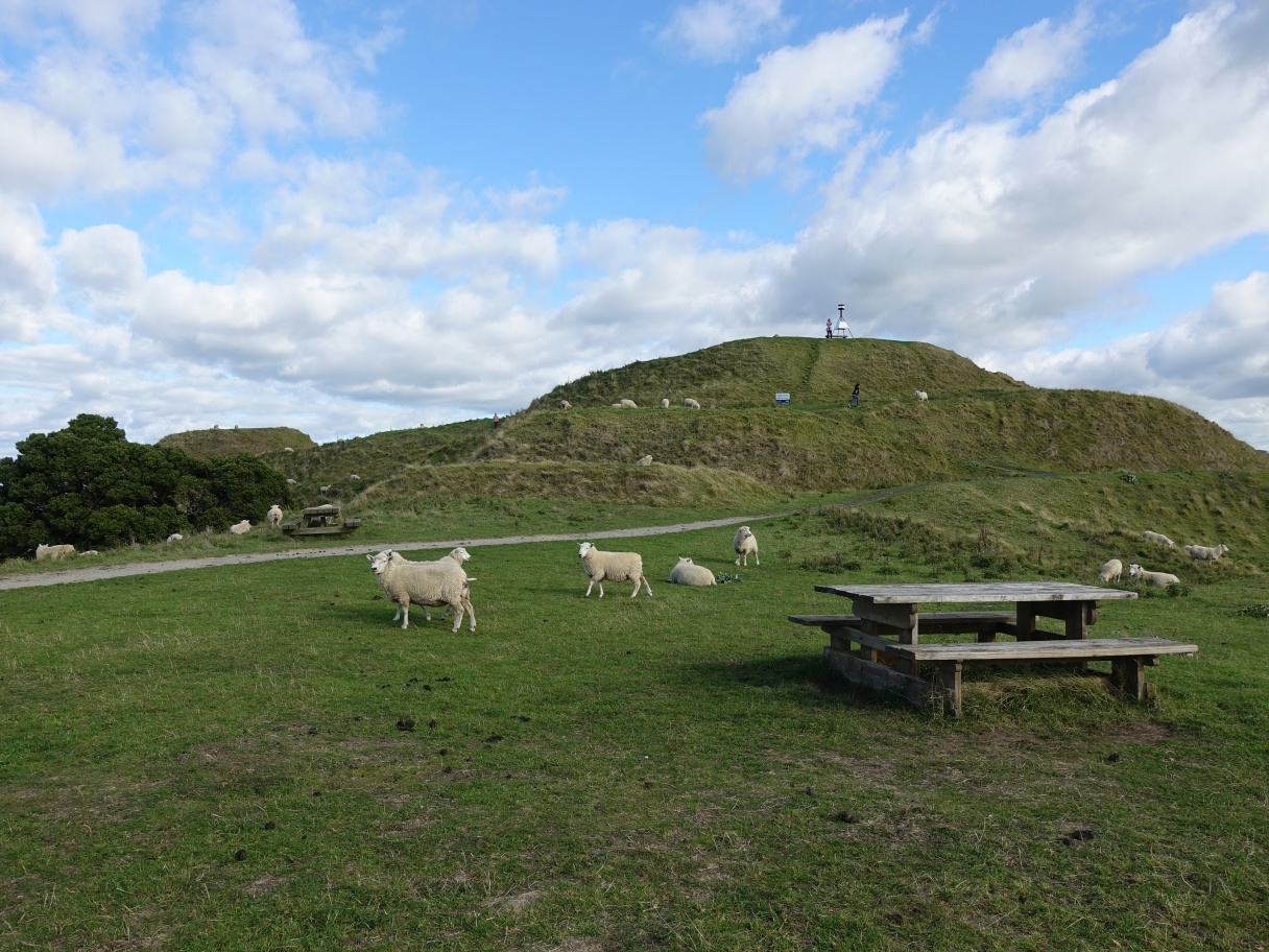 The end of Te Rae o Papamoa Track, with the trig station on the summit clearly visible, and the summit track visible above the foreground sheep.