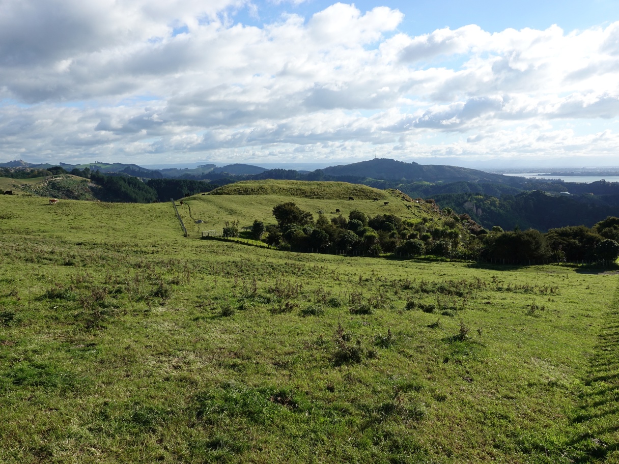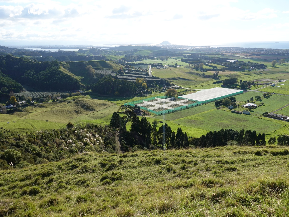 Looking across from Patakatahi towards Kopukairua, the highest point on the horizon, with Patangata pa site in front and to the left of it. Mauao/Mt Maunganui is just off the picture to the right.