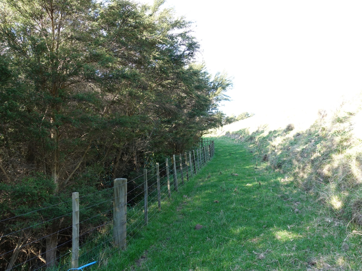 The track continues down the ridgeline to an unnamed pa site. Te Rae o Papamoa Track crosses the fence on the stile just above the nearest trough.