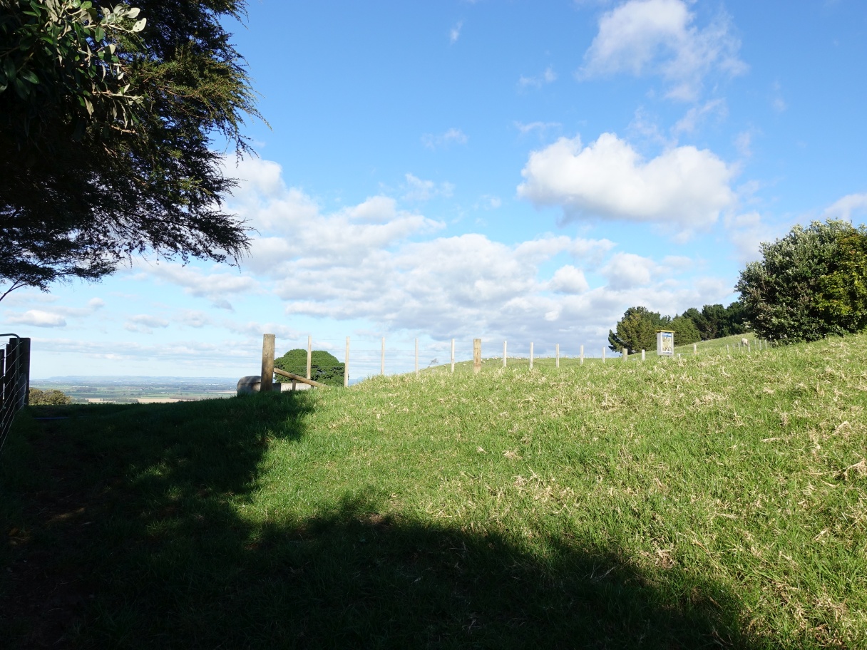 Continuing along the ridgeline to Patakatahi pa site in the gap between the trees. There is a stile and an information panel by the fence.