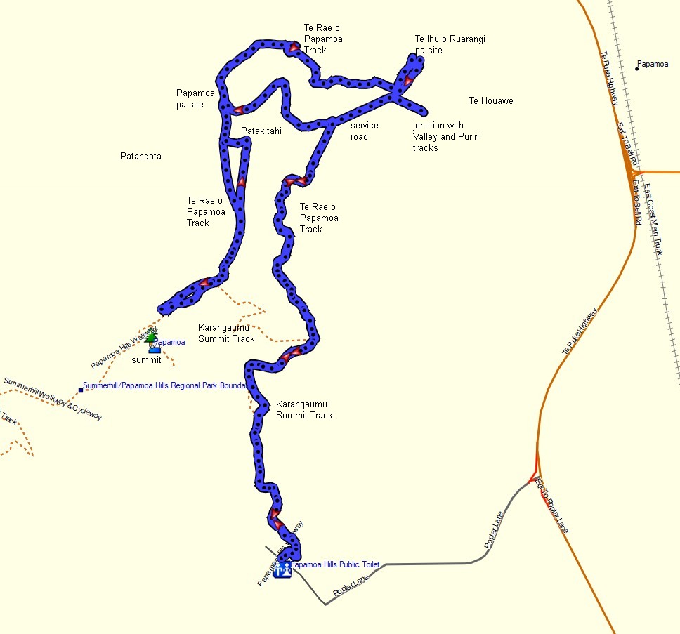 The GPS tracklog shows the route followed as well as points of interest along the way. Total distance walked was about 7 km and took 2 hours. This included short side tracks to pa sites and to the junction with Valley and Puriri tracks. The summit track between the carpark and the end of Te Rae o Papamoa Track is about 920 metres, with the remaining 5.1 km and 1 hour 30 minutes walking time being Te Rae o Papamoa walked in both directions.