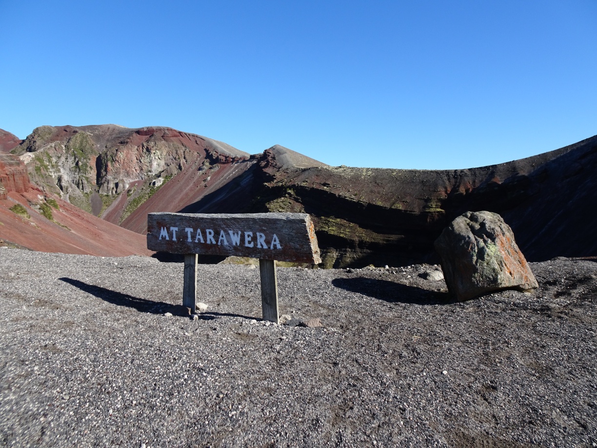 The sign at the summit of Mt Tarawera. The GPS showed 1114 metres elevation at the geodetic marker nearby. Lake Tarawera can be seen to the right and above the sign.