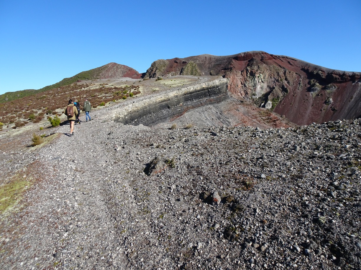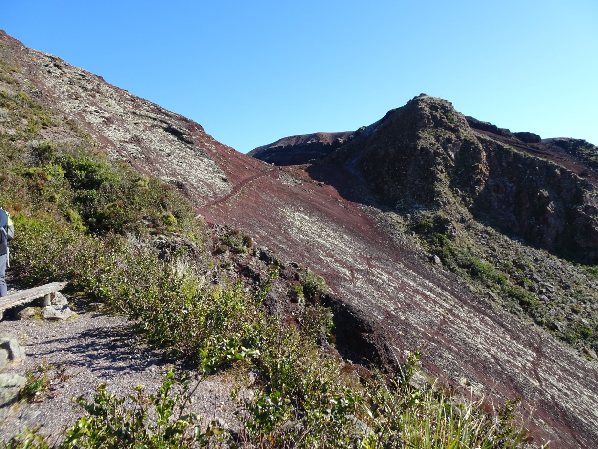 Heading down from the summit towards the steep descent, which can be seen leading down to a track at the crater floor at the lower far right.