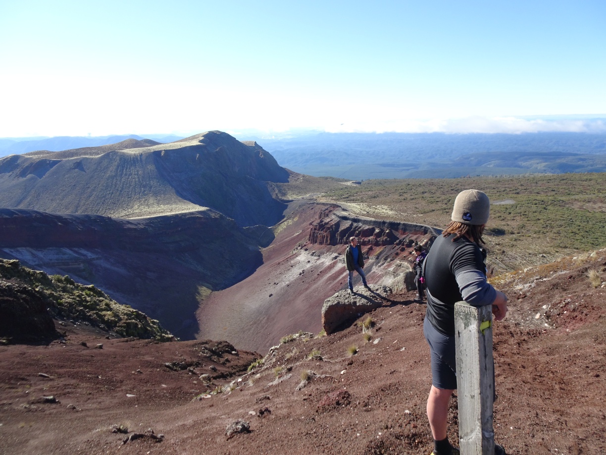 A rock platform on the crater edge is a popular spot for photos. Our Kaitiaki Adventures guide is taking a rest by the marker post.