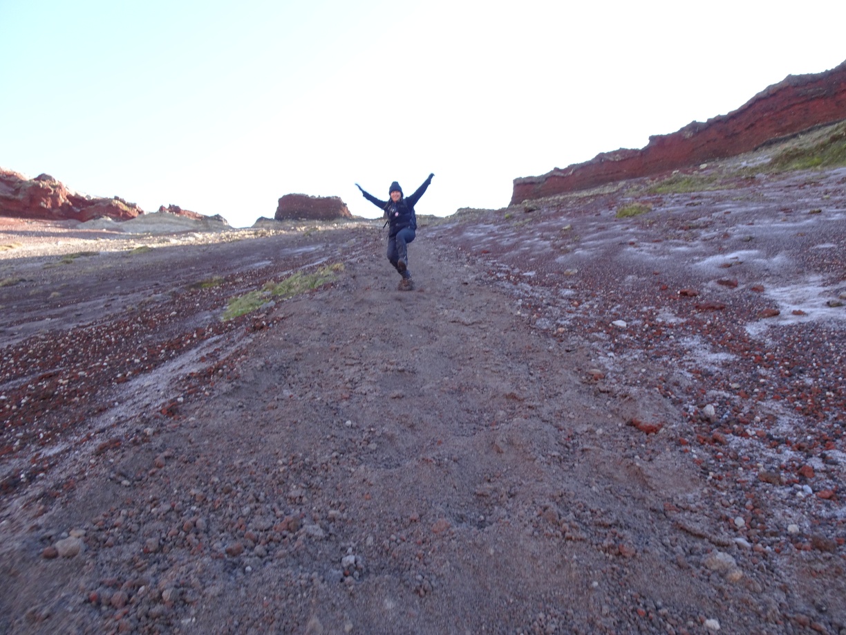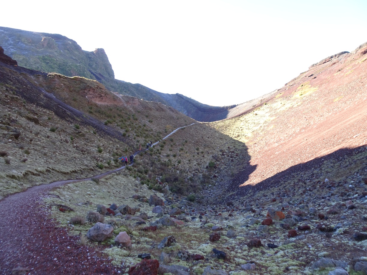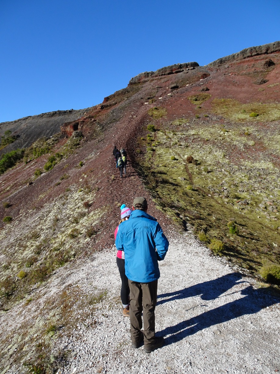 The final ascent back up to the crater rim, not far from the bus parking area. A challenge to run up the track as far as possible was met by one member reaching the fourth step seen near the top before sliding and coming to a stop.