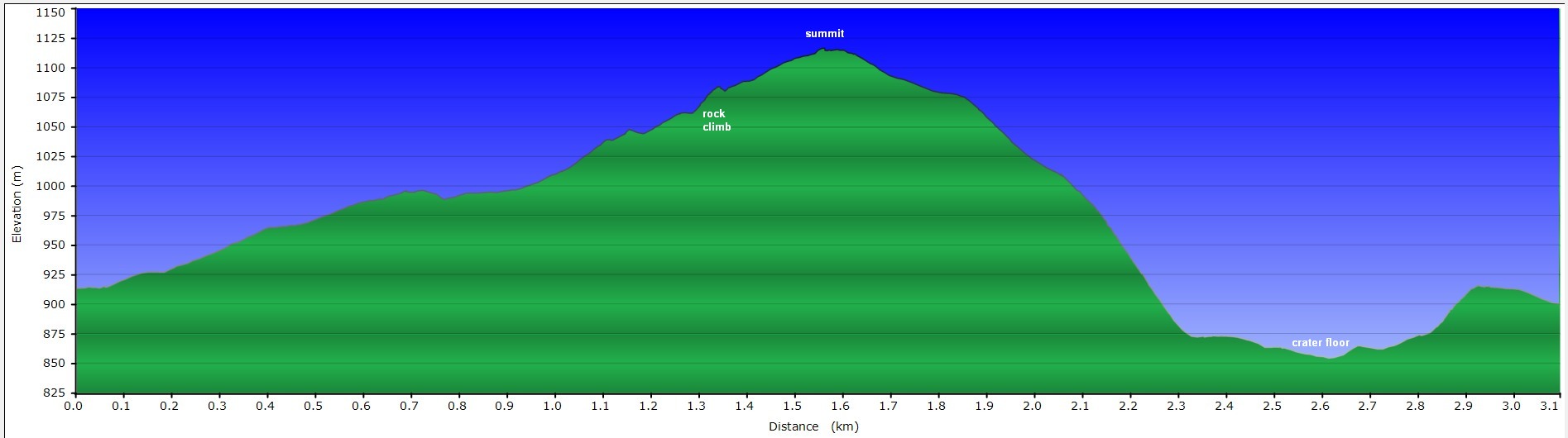 The summit of Mt Tarawera is 1111 metres above sea level, and the bus parking area is about 900 metres a.s.l, so there is a mostly gentle climb of about 200 metres to reach the summit. One short climb near the summit, known as the rock climb, is the most difficult part of the walk. Anyone not able to complete the walk is asked to turn around before the rock climb and return along the crater rim to the bus park. The rock climb is the point of no return.