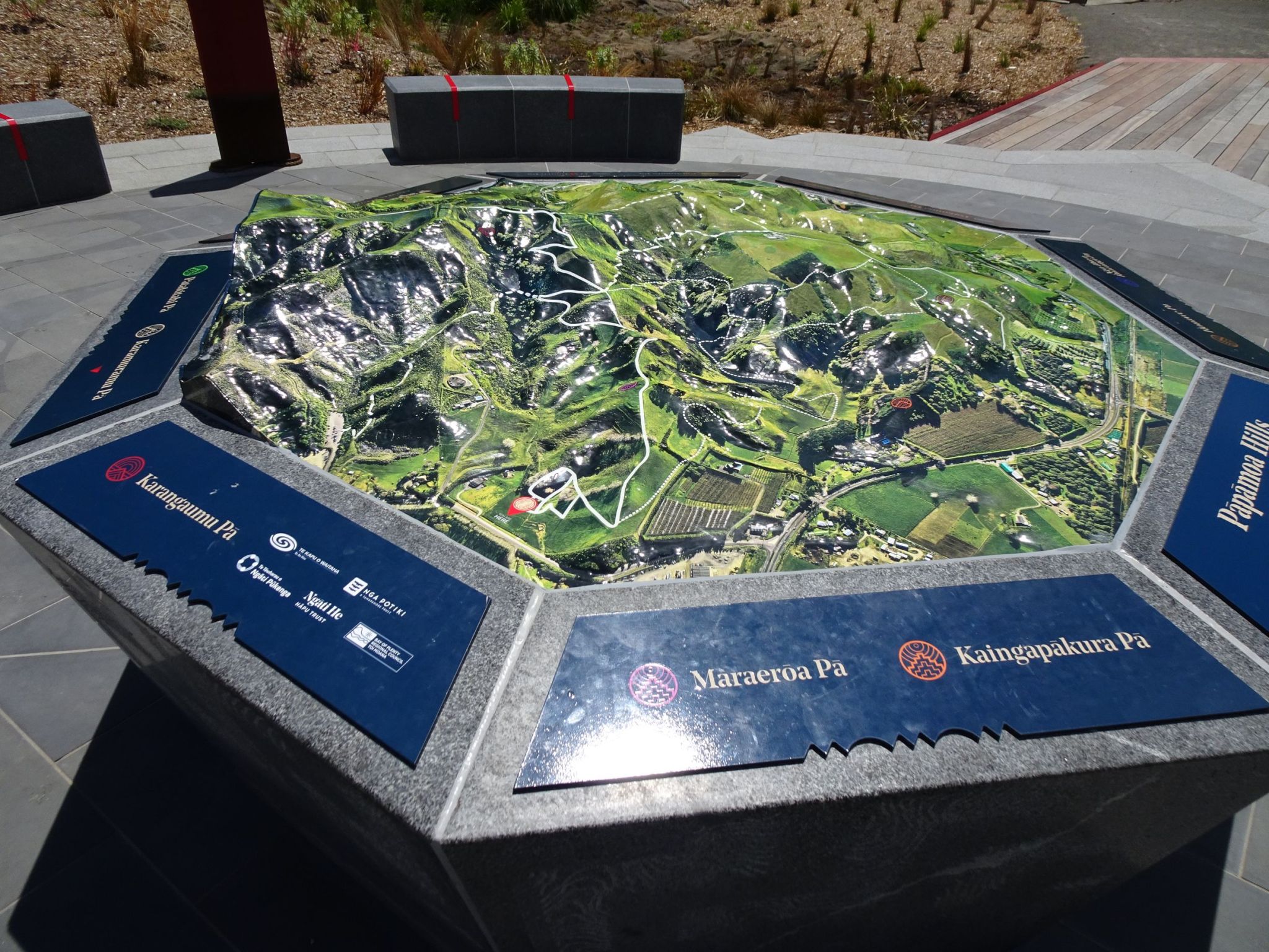The tomokanga or entryway to the tracks. The pedestal at the centre contains a 3D map of the park, showing the tracks. A short, circular, wheelchair-friendly track can be seen behind the portal, as well as the start of the track leading to the summit. The circular track is about 175 metres long, and part of it is a boardwalk over a swampy area.