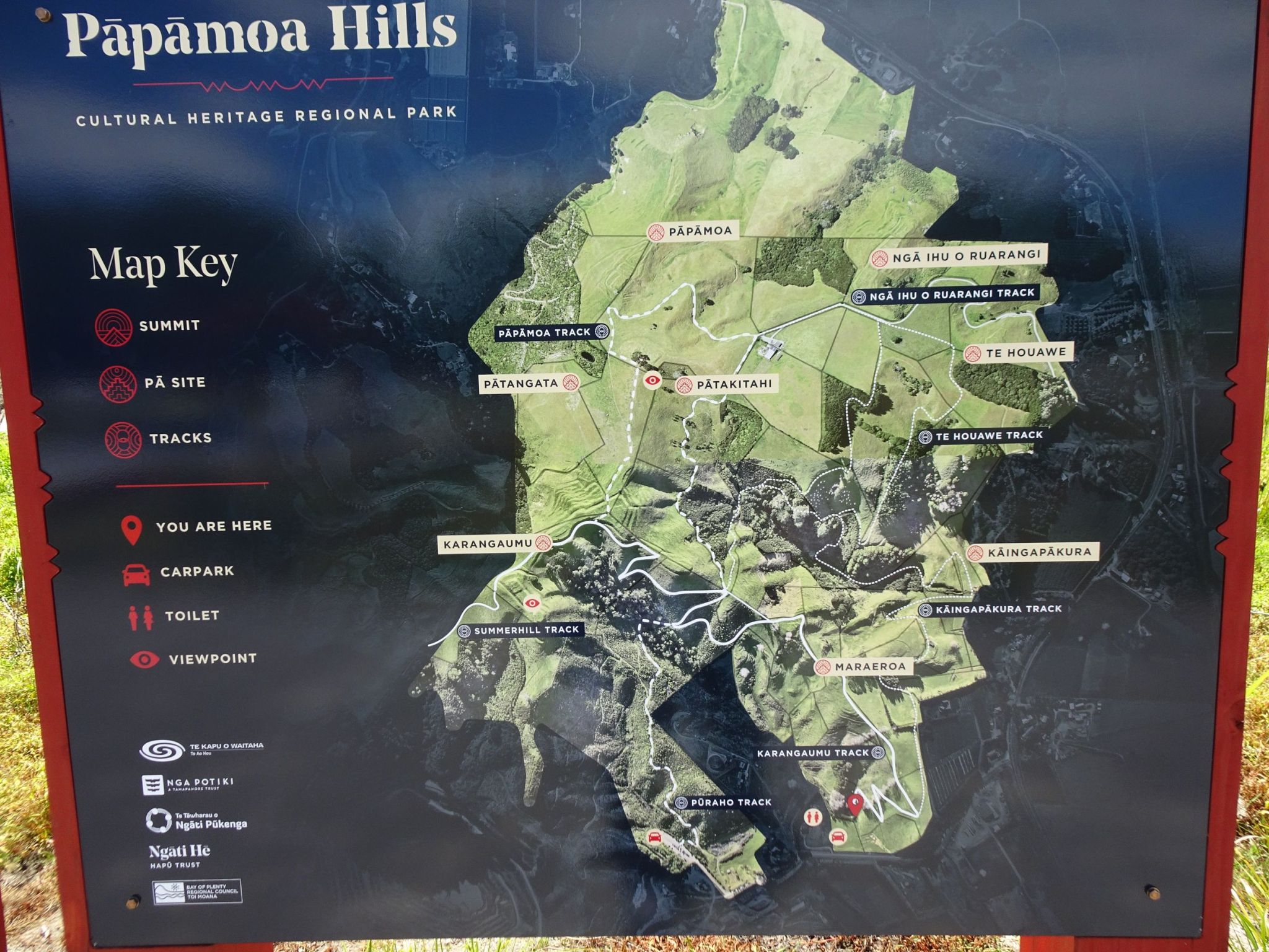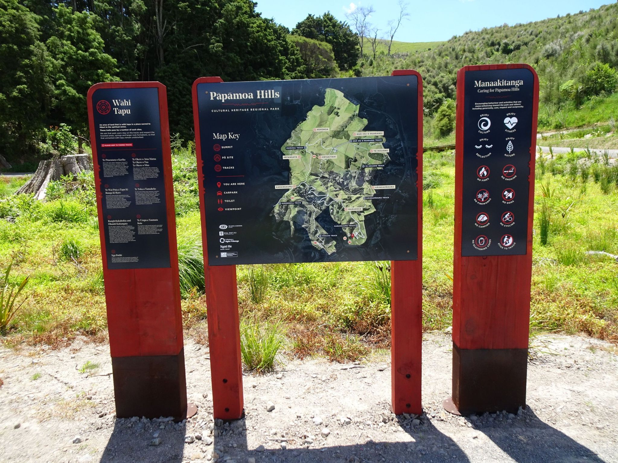 A new entrance to the Pāpāmoa Hills Cultural Heritage Regional Park, including parking area, toilets, entryway and tracks, was officially opened on November 25, 2023. Details of the dawn blessing were covered on the SunLive website and in the Bay of Plenty/Te Puke Times. More details of the park can be found on the Bay of Plenty Regional Council web site. The old carpark is still available.