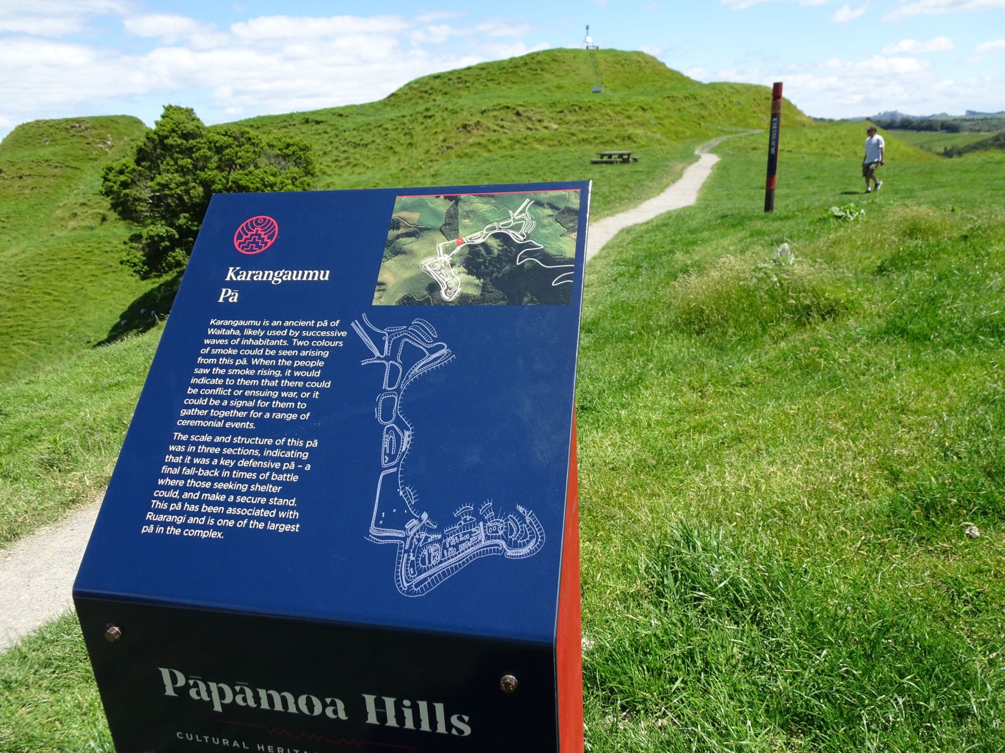 One of the new information panels describing the Karangaumu pā site at the summit. The trig station at the summit can be seen at top of picture.