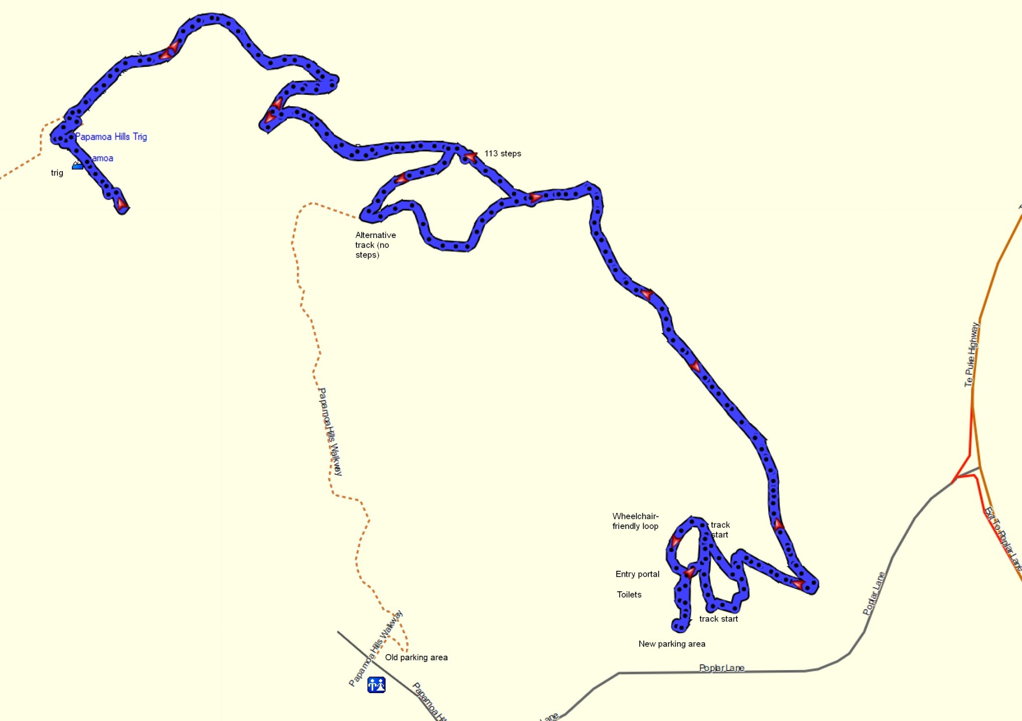 The entry is directly off Poplar Lane, a no-exit road off Te Puke Highway. The start of one of the tracks can be seen just to the right of centre with a few steps. Another track start is just to the left of centre, not far from the entry portal. There are no steps at the start of that track. The two tracks join almost directly above the steps before heading off to the right off the edge of the photo. The toilets are off the photo to the left.