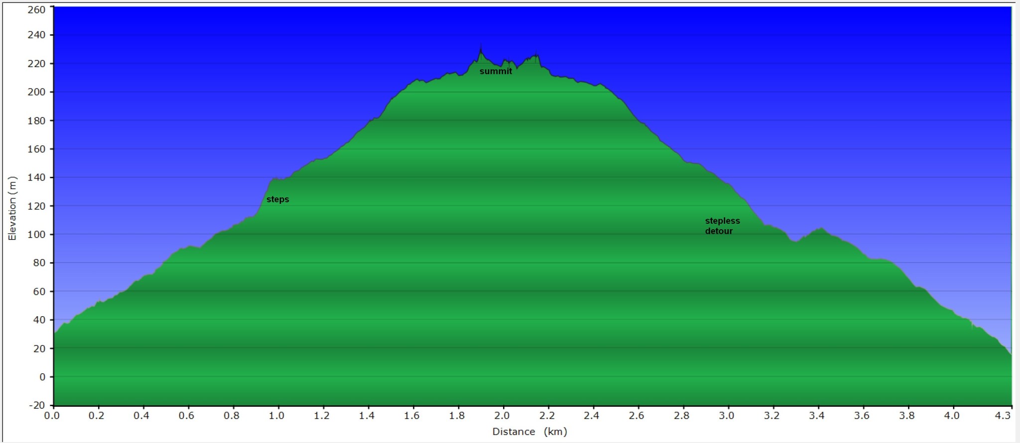 The GPS tracklog shows the tracks followed, together with a few annotations. The walk to the summit, including the staircase was about 1.9 km long and took about 40 minutes of slow walking. The return walk via the alternative route without steps was about 2.1 km long and took just over 30 minutes.