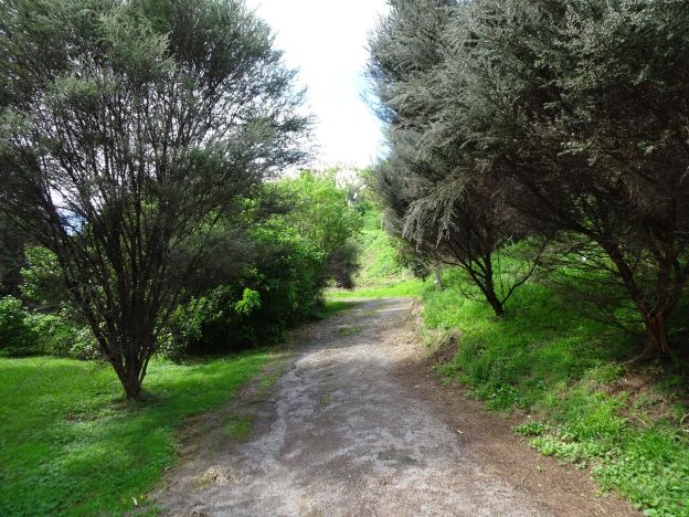 Old Reservoir Road off SH2 about 1.5 km east of Paeroa is a short road, partly tarsealed, and partly a narrow gravel road. At the north-eastern end of the formed road an old ‘paper road’ continues on from a locked gate and past the old water reservoir dam. The road has once been drivable as far as the dam, but from there it continues on as an unmarked tramping track. The track does not entirely follow the paper road, which apparently continues all the way to Waitekauri Road, and there are no indications that it has ever been formed as a road.