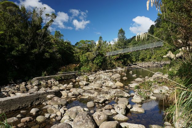 The Waitawheta Tramway Track follows a tramline used in the early 20th century to extract wood from the Waitawheta Valley, first for gold mining operations, and then Kauri logs and timber. The tramway runs for almost 10 km from Franklin Rd (off Waitawheta Rd) to a sawmill site and the Waitawheta Hut. There are 8 crossings of the Waitawheta River, with all except one of them now spanned by bridges. There is a detour track available which bypasses the unbridged crossing.